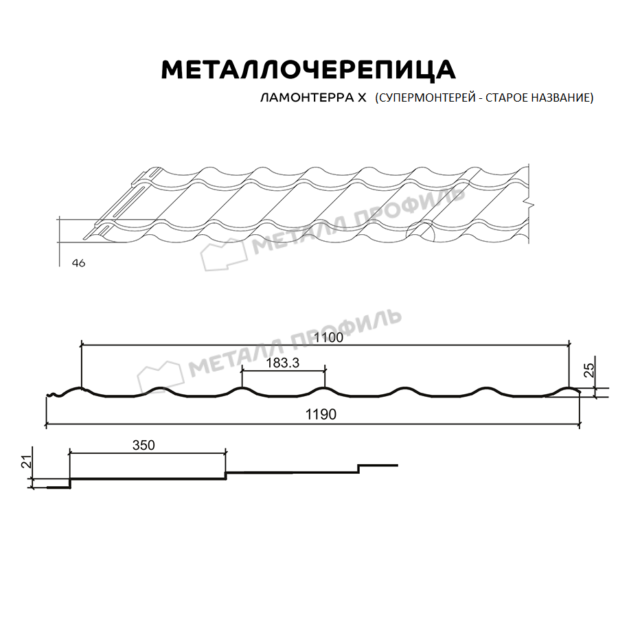 Следующий уровень эволюции хорошо известной металлочерепицы МОНТЕРРЕЙ. Усовершенствованная версия имеет увеличенную глубину профиля (46 вместо 39 мм) за счёт более высокой ступеньки (21 вместо 14 мм). Благодаря этому кровля выглядит объёмнее, обретает более рельефный вид. Гораздо выразительнее такая металлочерепица смотрится на крупных и ровных скатах. В остальном Ламонтерра X сохранил все преимущества предыдущего профиля — долговечность, устойчивость к механическим нагрузкам. Данная металлочерепица имеет широкий ассортимент оттенков, что позволяет с лёгкостью сочетать её с любыми другими стройматериалами, будь то сайдинг, дерево, кирпич. Ламонтерра X удобен и лёгок в установке и несложен в обслуживании.