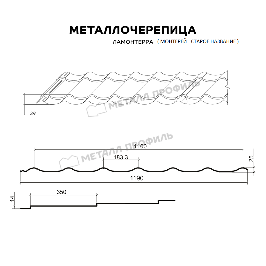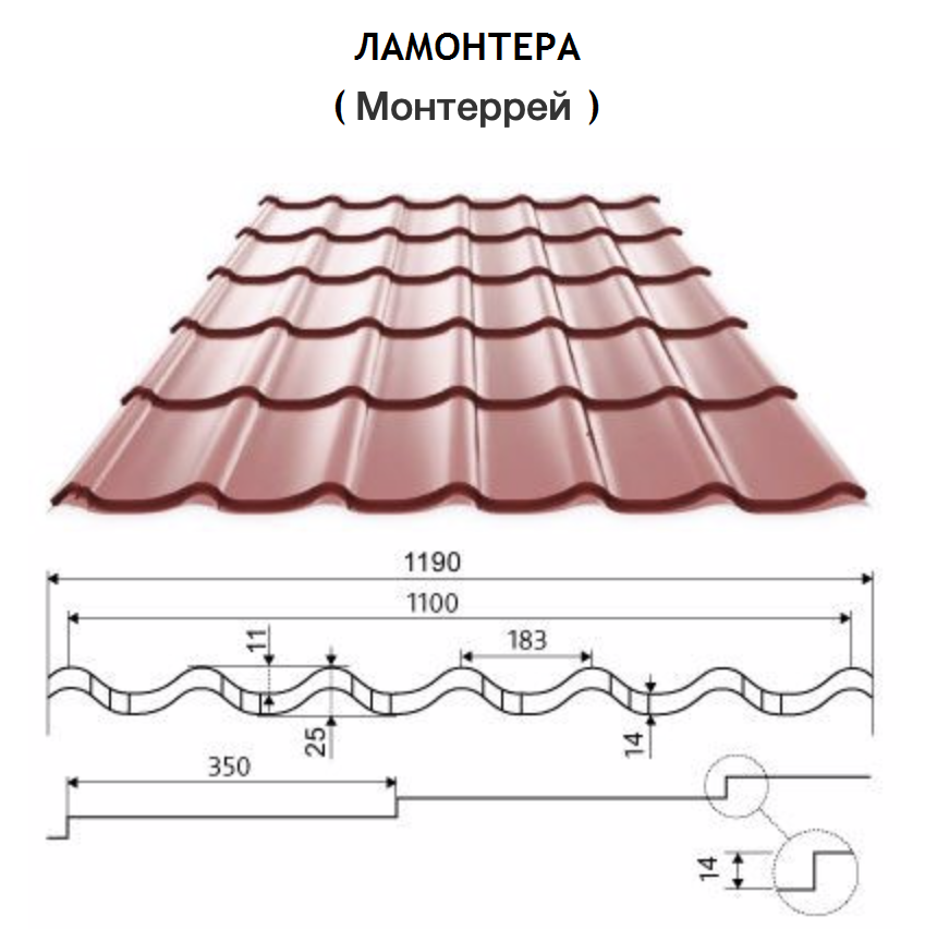 Ламонтерра — металлочерепица традиционной формы. Глубина профиля составляет 39 мм, длина ступени — 350 мм. Это вариант, который оптимален для небольших крыш. Кровля, покрытая металлочерепицей Ламонтерра, подчеркивает утончённый вкус домовладельца. Асимметричный профиль смотрится по-разному в зависимости от угла обзора. Такая металлочерепица подойдёт для использования в умеренном климате. Украсьте свой дом стальной черепицей в профиле Ламонтерра!